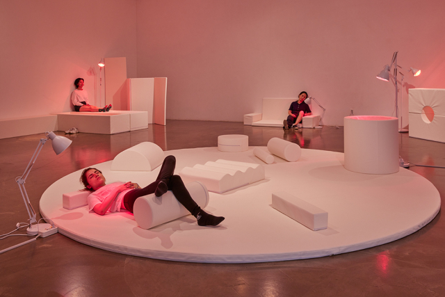 조영주의 ‘휴먼가르텐’은 돌봄이 이뤄지는 장소에서 영감을 받은 설치 작품으로, 관람객이 앉거나 기대어 쉴 수 있다. 이 작품은 행위예술가의 라이브 퍼포먼스 ‘인간은 버섯처럼 솟아나지 않는다’의 무대가 되기도 한다.
